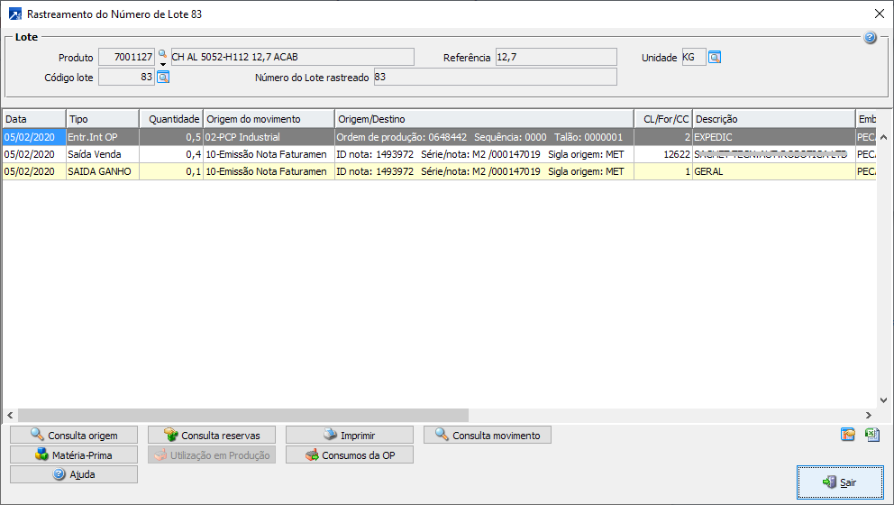 Na lista exibida estão as informações básicas da movimentação bem como da origem da movimentação. Para consultas mais detalhadas existem no rodapé da janela botões para diversas consultas sobre o registro de movimento selecionado na lista, sendo os principais o <Consulta origem> que exibe os dados completos da origem que gerou a movimentação (NF de entrada, NF de venda, Ordem de produção, etc) e o <Consulta movimento> que exibe os dados do registro de movimento no estoque que movimentou o lote.