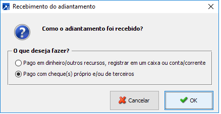 Empresas que trabalham com cheques, normalmente, o recebem de clientes - como adiantamento ou pagamento de vendas. No momento do seu recebimento o SIGER® irá solicitar alguns dados para o controle seja possível.