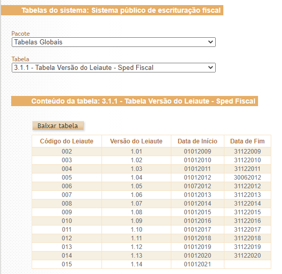 Validação: Válido para o período informado. A versão do leiaute informada no arquivo deverá ser válida na data final da escrituração (campo DT_FIN do registro 0000).