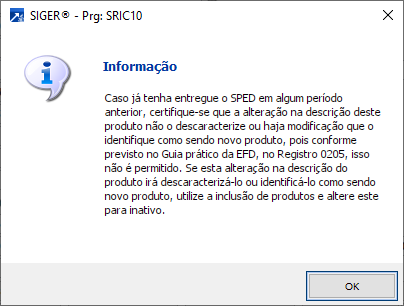 O SIGER permite a alteração da descrição do produto exibindo uma mensagem de alerta, com instruções extraídas do manual do SPED Fiscal, conforme segue abaixo: