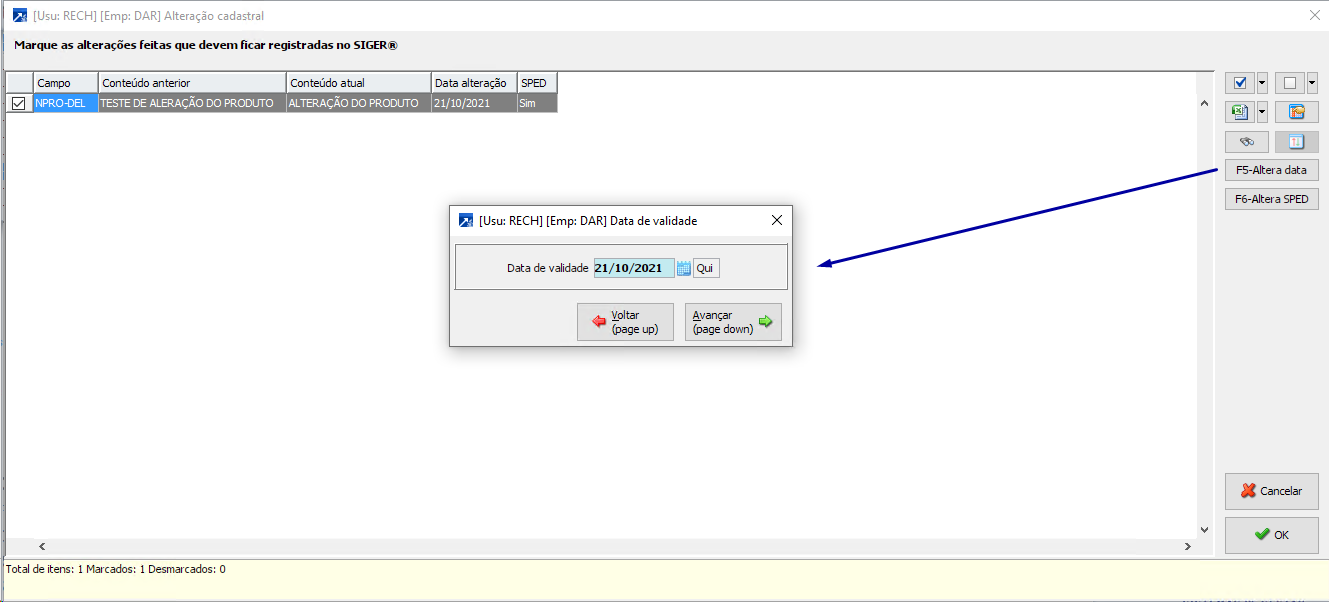 Caso o usuário opte pela alteração, o sistema grava a descrição anterior, podendo ser consultado ou alterada a sua data de alteração ou se irá gerar a informação ou não para o SPED Fiscal, no botão "Alt.Cadastral", do cadastro de produtos do SIGER.