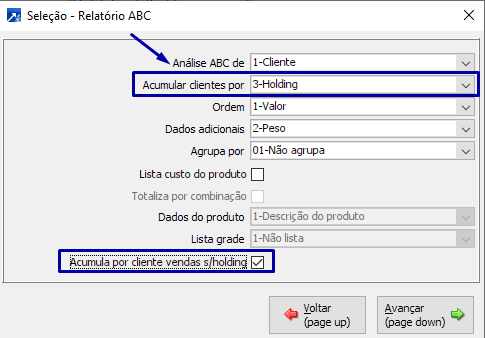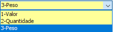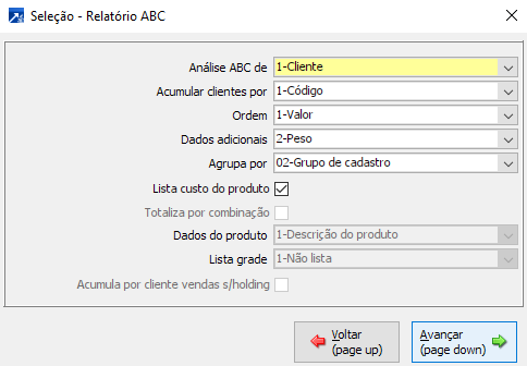 Esta é uma das configurações mais importante do relatório pois indica que análise ABC será ou por valor (R$ opção 1), por quantidade (opção 2), por peso (opção 3)