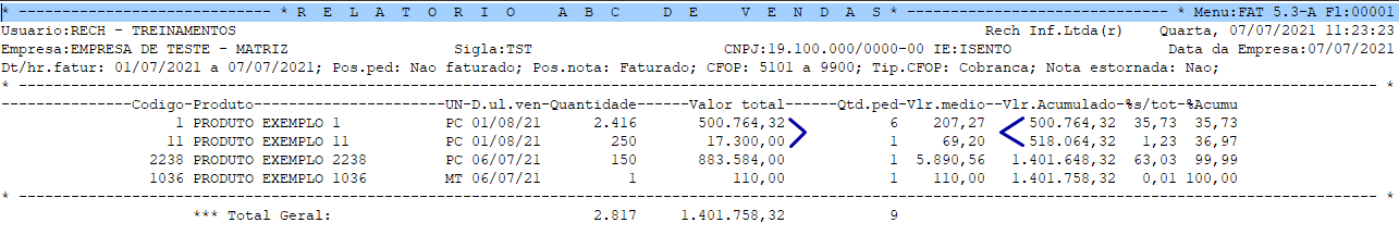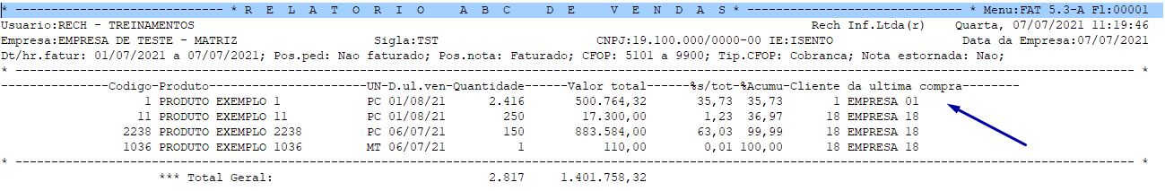 Apesar de ser um relatório por produtos, o sistema irá "criar" uma coluna com o cliente da última compra daquele produto referente ao período filtrado.