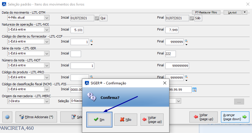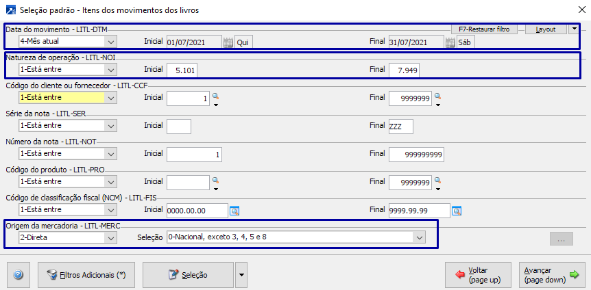 Veja que além da "data de movimento" e da "origem da mercadoria" nós filtramos também a "natureza da operação"  onde inserimos filtro para o sistema pegar operações que vão desde a CFOP 5.101 até 7.949