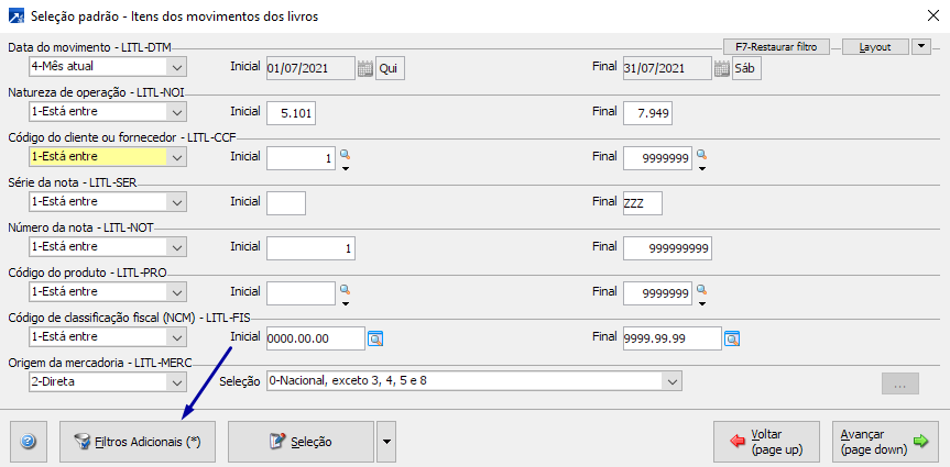 Na mesma seleção padrão clique em <Filtros Adicionais>