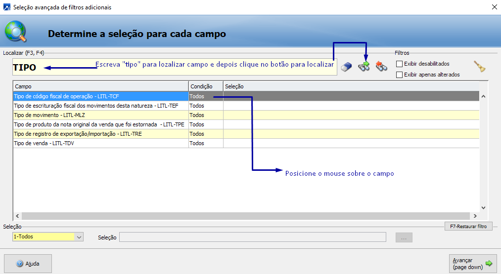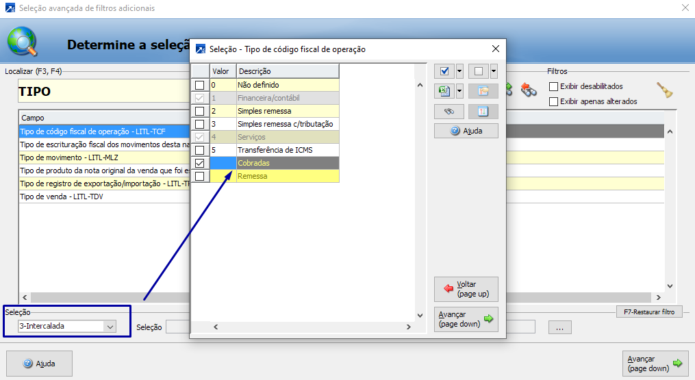 Uma vez posicionado mouse sobre o campo "Tipo de código fiscal de operação" vamos acessar o campo "Seleção".
