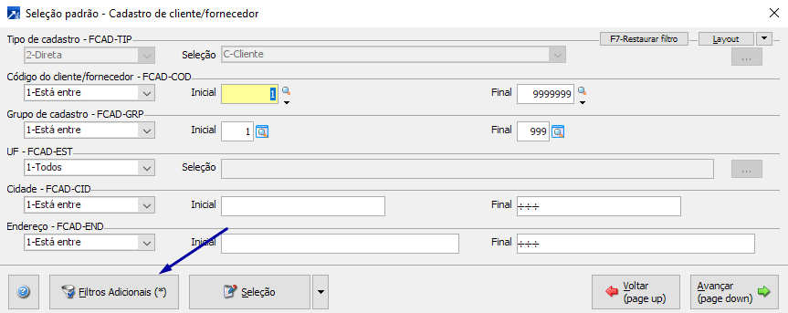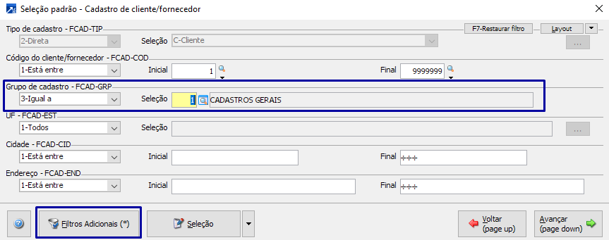 Essa tela é bastante útil para, por exemplo, filtrar no relatório somente os cadastros de um determinado grupo.