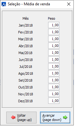 Este peso é multiplicado pela quantidade/peso acumulado no período. Portanto, se estiver zerado, a quantidade/peso do período não irá compor a média de vendas.