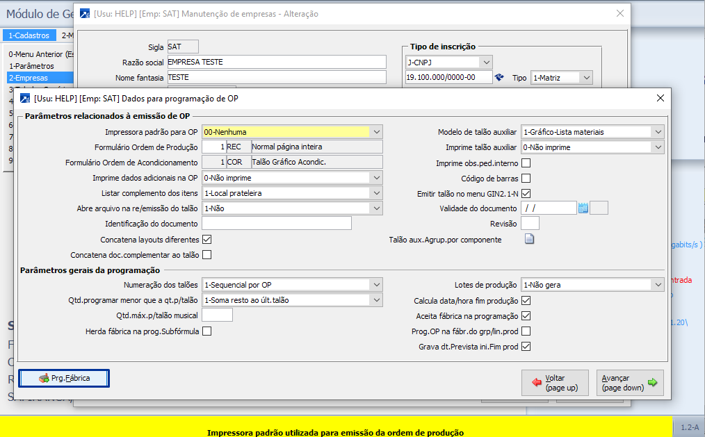 Na opção de menu GIN 1.2-A- Alteração de empresa, é possível selecionar e utilizar o layout padrão do sistema ou configurar um novo layout personalizado para a programação da fábrica: