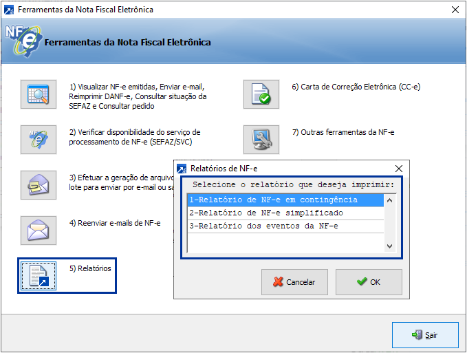 A opção de Relatórios nas Ferramentas da NF-e trás três relatórios específicos relativos a Nota Fiscal Eletrônica.