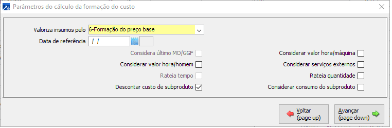 Parâmetros para cálculo do custo da formulação - habilita quando indicado a "Origem do custo base" como 5-Custo da Estrutura, e o produto possui formulação.