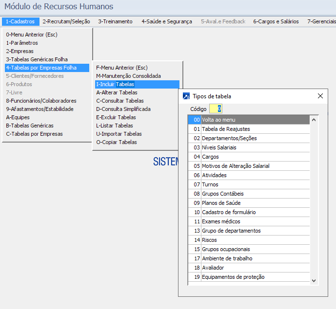 No menu 1.4-M e 1.4-I são cadastradas as tabelas por Empresas, as mesmas servem somente para a sigla/Empresa especifica selecionada, ou seja, não valem para as demais siglas/Empresas da mesma base do SIGER®.  Abaixo temos a lista das tabelas por sigla/empresas utilizadas no módulo de RHU.