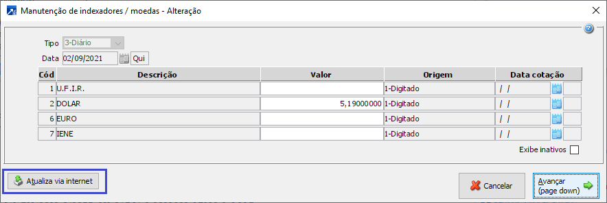 Também pode ser feita ao abrir janela (abaixo) de Manutenção de indexadores / moedas, ou pelo menu FIN 1.8-A.