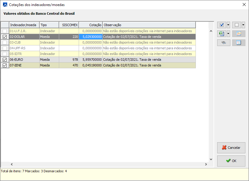 Atualiza as cotações de indexadores/moedas automaticamente via Internet.