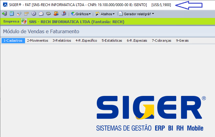 Irá exibir a taxa da moeda no título da janela principal do SIGER®, ao lado das informações da empresa em processamento.