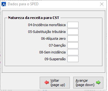 Configurações de natureza de receita de CST para SPED.