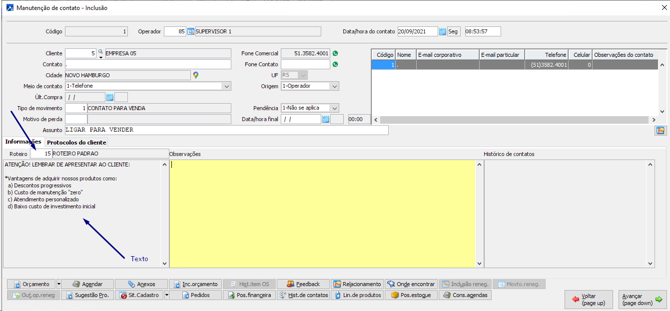 É o texto inerente ao "script" que será exibido, por exemplo, dentro do contato do telemarketing.