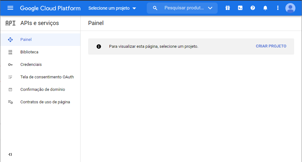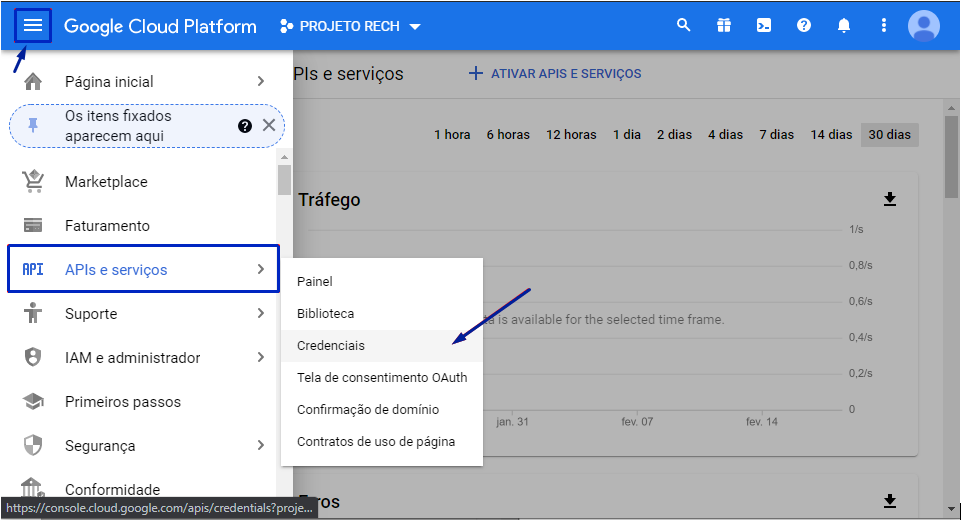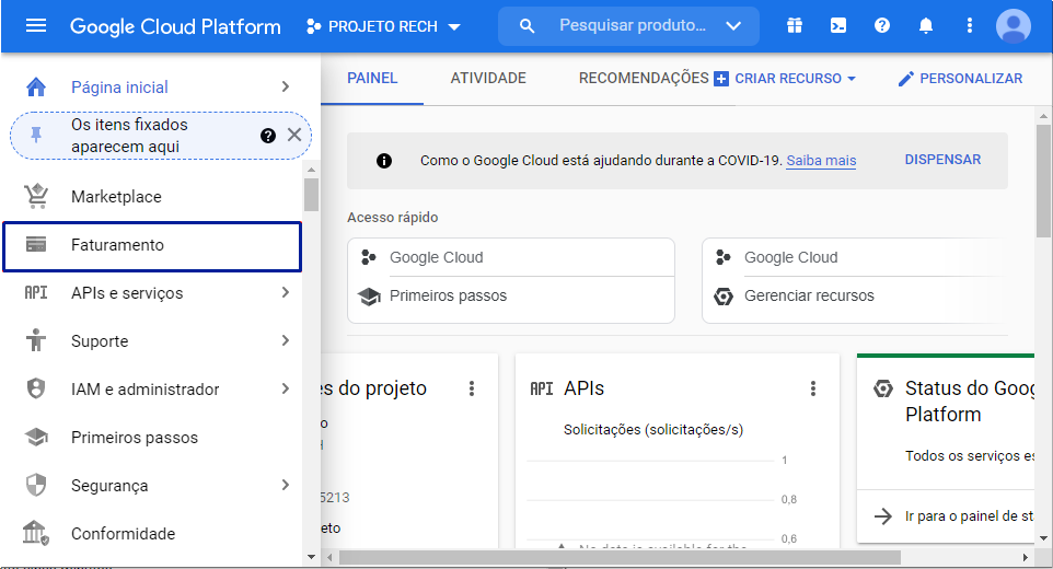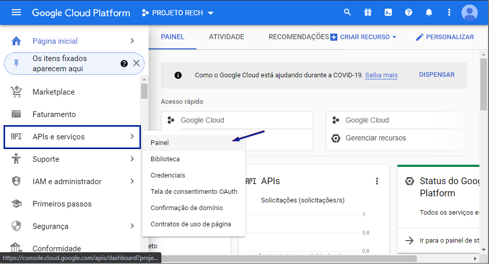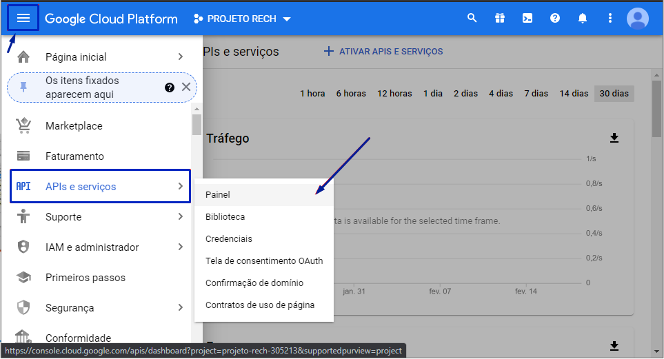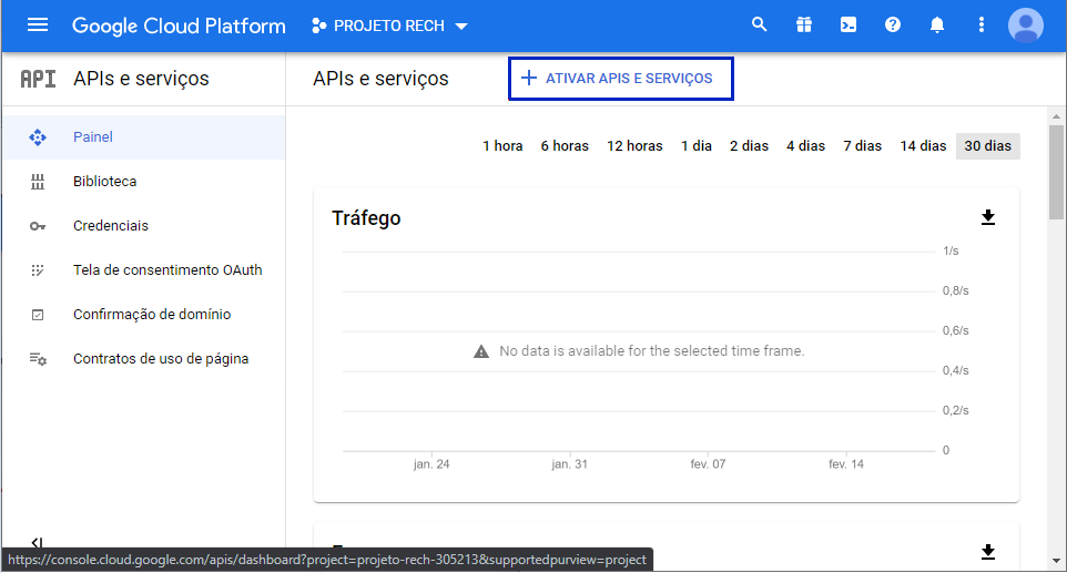 Após ativada a API, o site será direcionado para a página de monitoramento. Será necessário retornar ao painel principal e ativar as demais APIs acessando a barra de menu selecionando o painel.