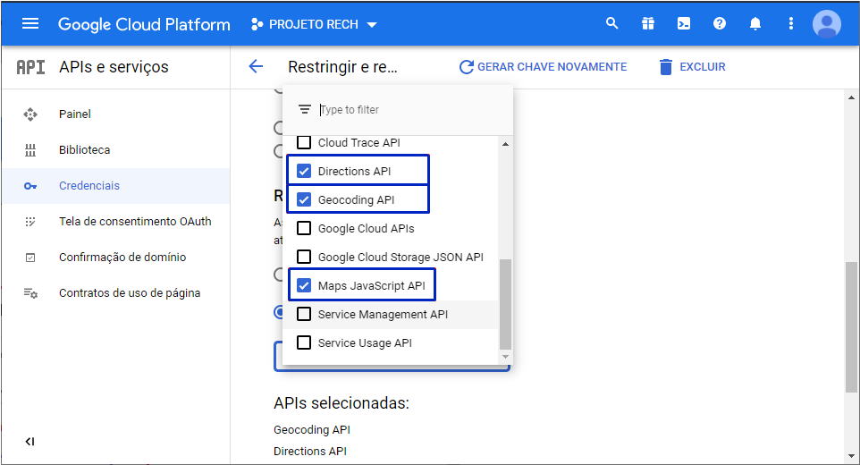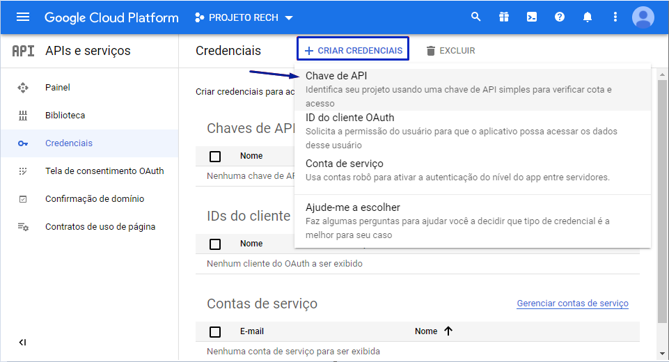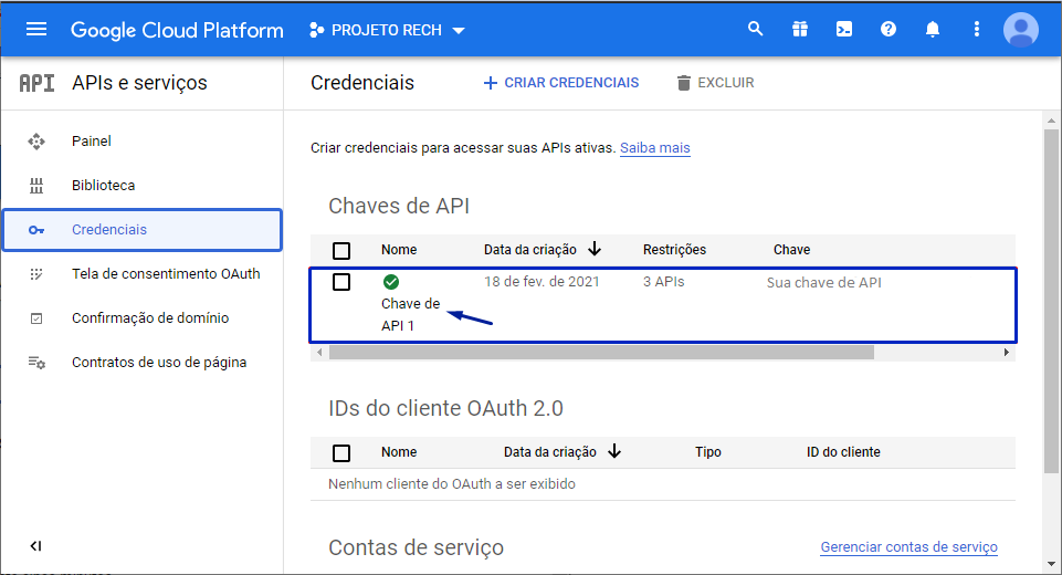 Gerenciar as credenciais após ativar todas as APIs necessárias.