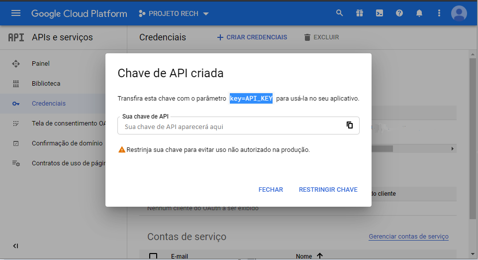 Para utilizar os recursos que dependem de uma chave de licença da Google API é necessário fazer o cadastro no próprio site da Google seguindo os seguintes passos: