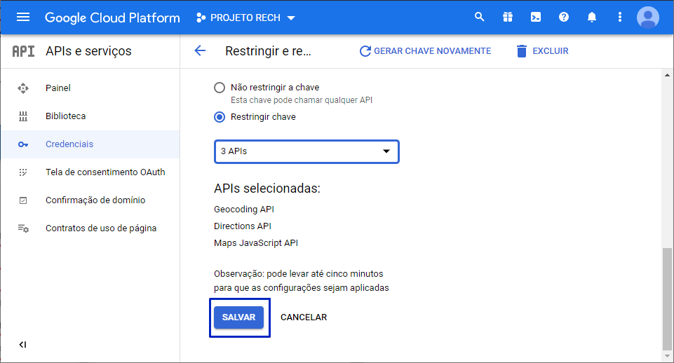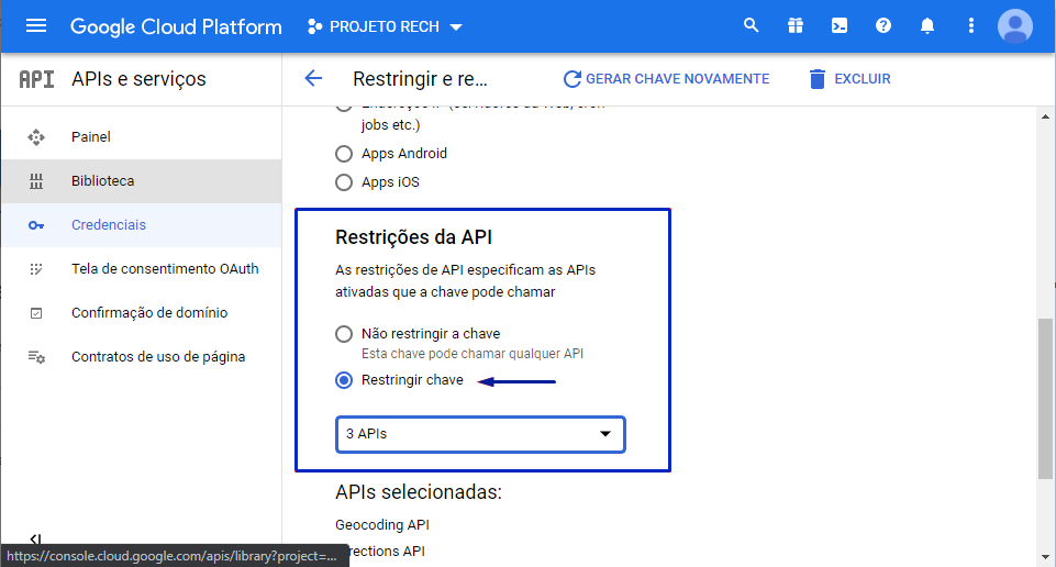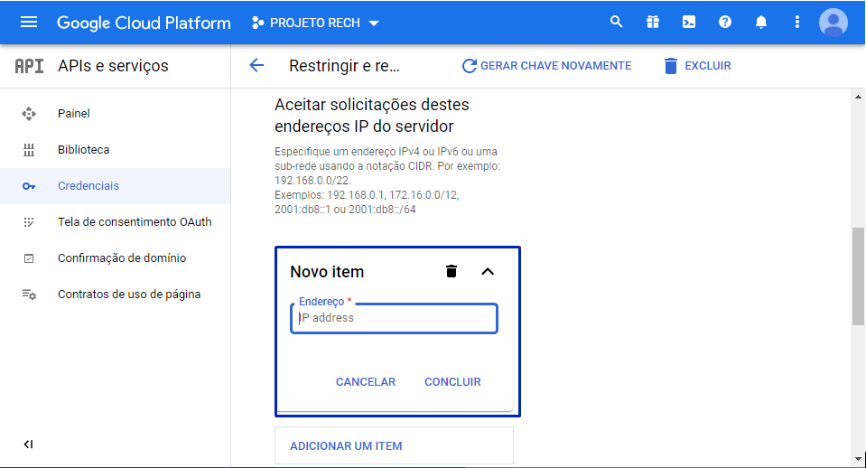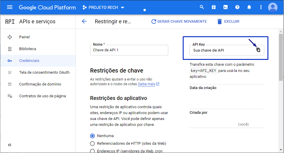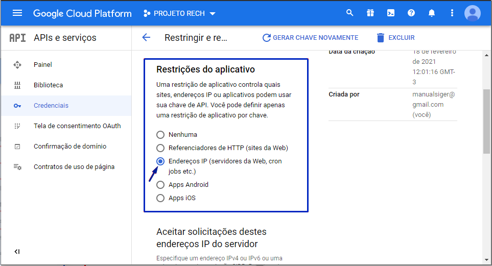 Em "Restrições do aplicativo" adicionar restrições de endereços de IP se desejado. Dessa forma o acesso aos recursos que dependem da chave de API só podem ser acessados por determinados endereços de IP.
