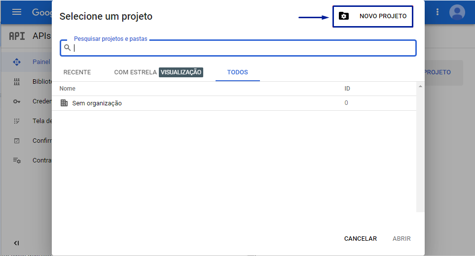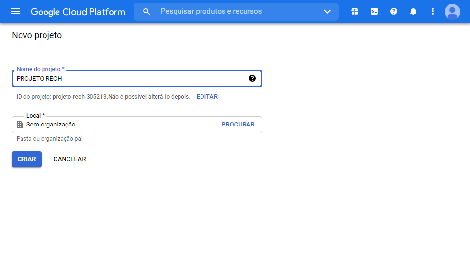 Sugerimos que utilize um nome de projeto que seja fácil de identificar na integração Google API com o SIGER®