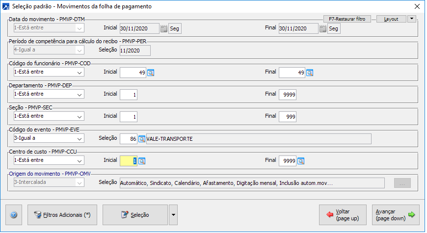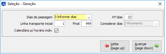 Mensalmente para usar a rotina, será necessário gerar o vale transporte MENU 2.5-G, informando os dias de passagens, código das linhas que serão geradas, ao avançar na tela seguinte, deverá informar a competência, e ao avançar, poderá filtrar os funcionários, departamentos, etc.