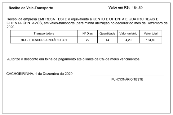 Após gerar o vale transporte, poderá listar os recibos no MENU 5.2-R ou MENU 2.5-M.