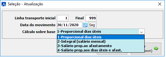 Neste MENU precisa ser filtrado as linhas de transporte inicial e final, informar a data do movimento que será gravado (normalmente último dia do mês), na opção CALCULO SOBRE A BASE, selecionar a regra de desconto.