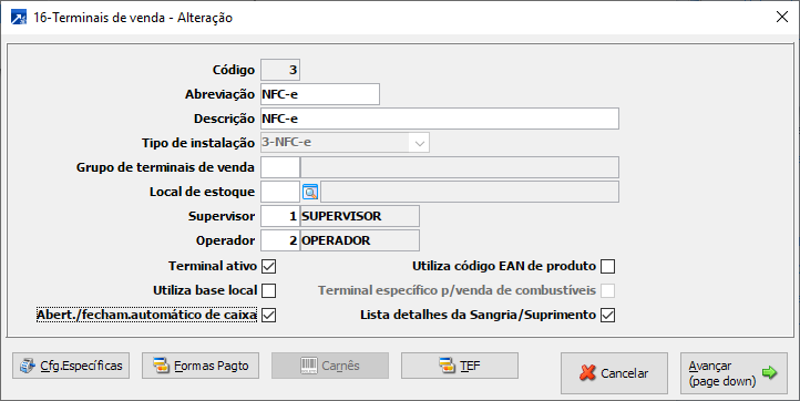Caso não deseje utilizar o recurso de "Abert./fecham.automático de caixa", ao informar o supervisor e operador no cadastro do terminal, eles serão carregados nas telas de aceitação da abertura e fechamento como sugestão para o terminal de vendas.