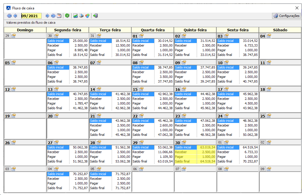 1-Previsto: A listagem de valores previstos considera todos os documentos do período pela data de vencimento ou fluxo. O saldo inicial diário será definido conforme os recebimentos e pagamentos previstos da data anterior.