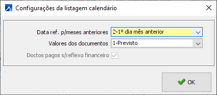 No botão <Configurações> estão disponíveis configurações para data de referência para meses anteriores e valores dos documentos.