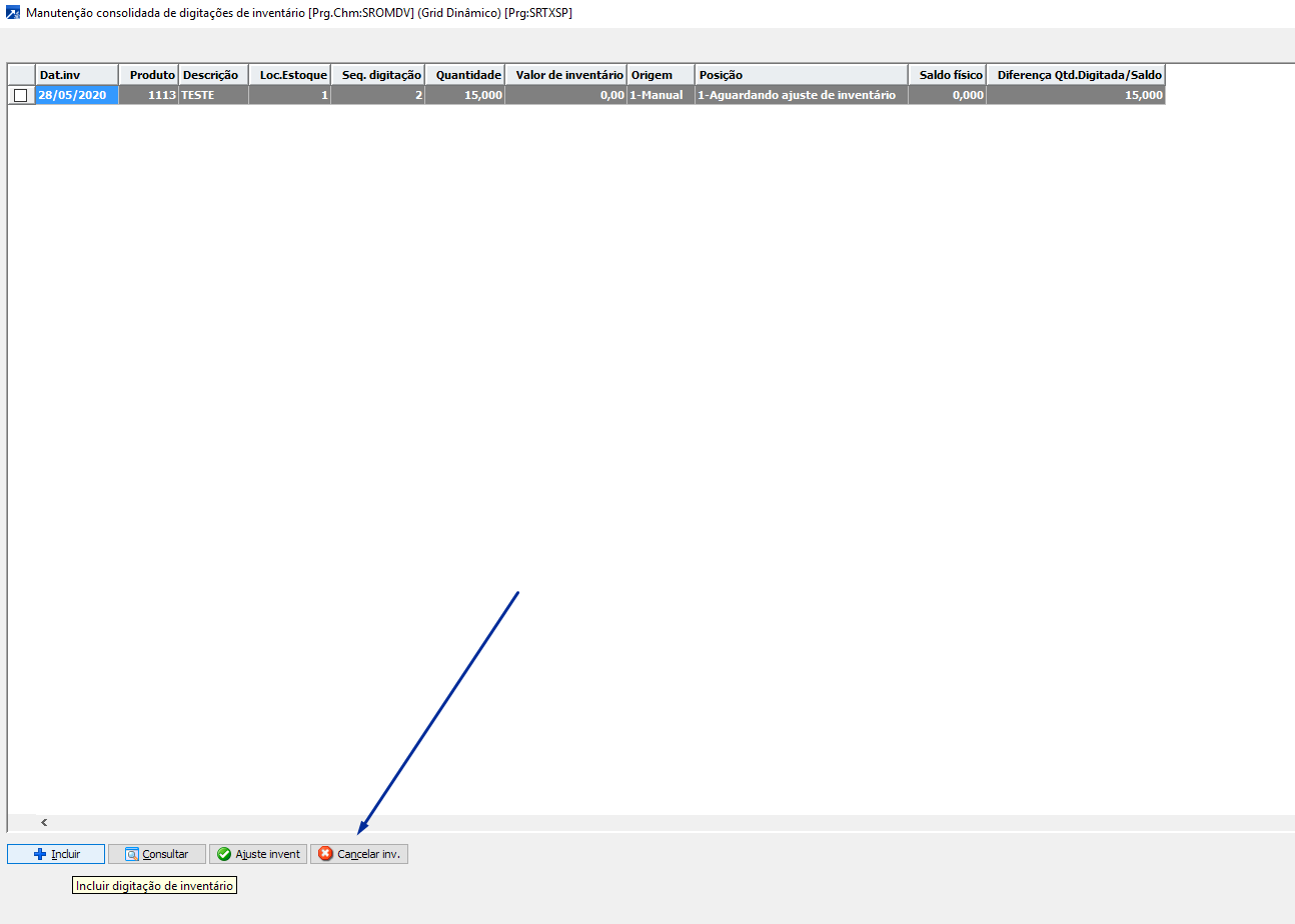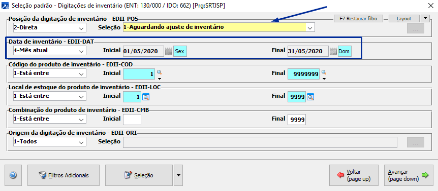 Na tela acima, filtramos somente digitações com posição 1-Aguardando ajuste de inventário e também todas as digitações com data entre 01/05/2020 a 31/05/2020.