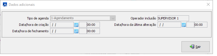 Exibe informações adicionais da agenda, tais como: data de criação, data de fechamento, nome do operador que a incluiu, etc.