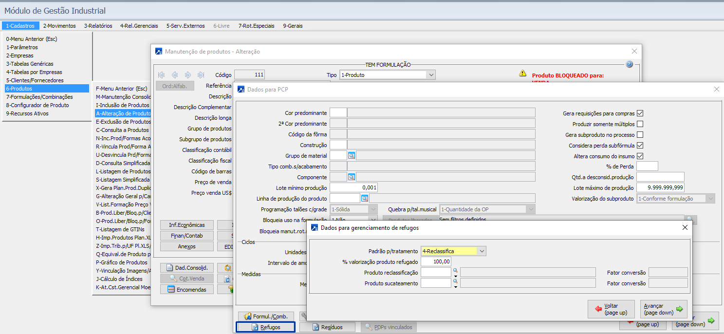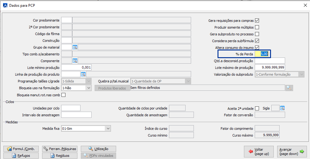 Ainda no cadastro do produto, no botão <PCP>: Definir o % de perda padrão do produto, que poderá ser utilizado como refugo ou ainda incrementado na quantidade da produção.