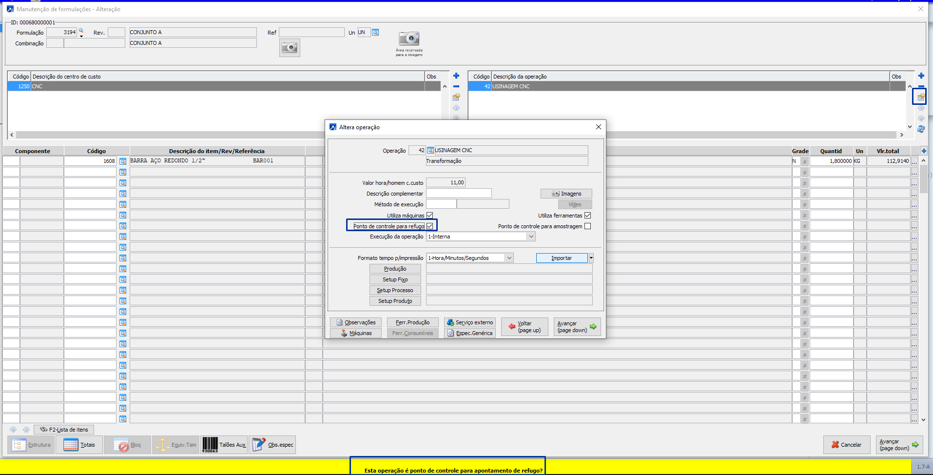 Acessar o menu 1.7-A manutenção da formulação, em Operações de produção, definir se é ponto de controle de refugos: