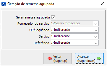 Nessa janela são definidos os agrupados para geração da remessa de serviço externo a partir da opção "P-Gerar Remessa Agrupada".