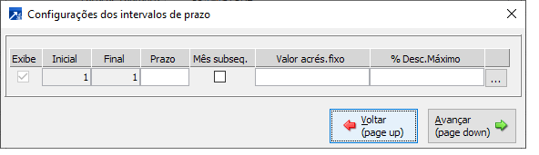 A coluna "Prazo" configura o número em dias em que a operadora irá efetar o pagamento neste intervalo de número de parcelas. É possível configurar com o prazo 0 (Zero), nos casos em que a operadora efetue o pagamento no mesmo dia da data da venda.