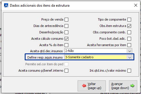 Campo "Define resp.aquis.insumso = 3-Somente cadastros"