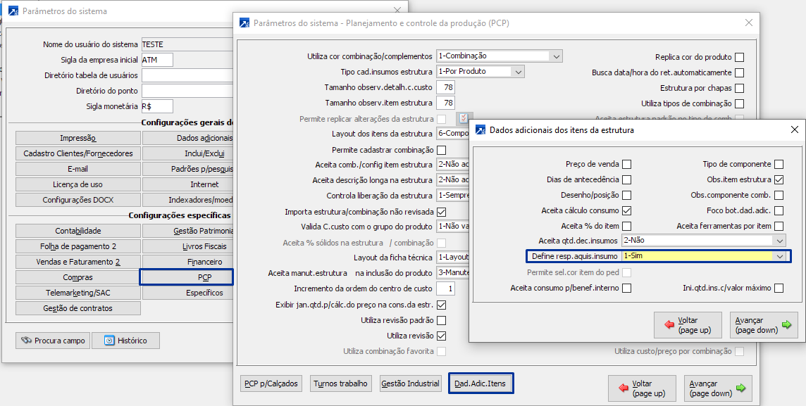 No GIN 1.1-P, botão <PCP>, botão <Dad.Adic.ItensGestão Industrial>, campo "Define resp.aquis.insumo=1-Sim":