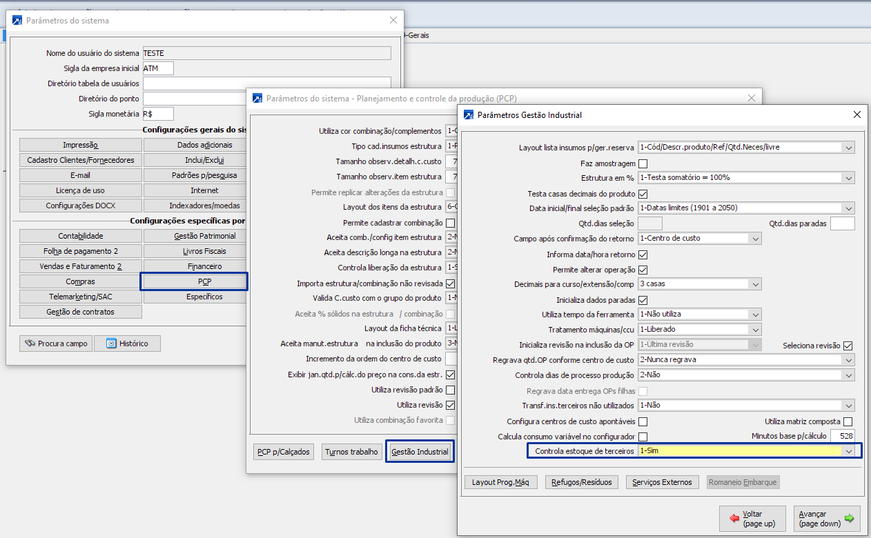 No GIN 1.1-P, botão <PCP>, botão <Gestão Industrial>, campo Controla estoque de terceiros = 1-Sim" (ativar o controle na produção e Faturamento):