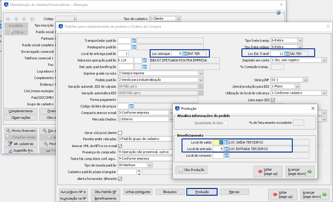 Também é possível definir os campos "Loc.estoque= Local de entrada do cliente" para entrada das notas fiscais do cliente, e campo: "Loc.Est.Transf.=Local de saída do cliente"para utilizar no faturamento na emissão das notas fiscais de retorno de beneficimento.