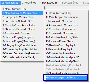 Menu: EST 1.2-A, botão: <Estoque>, botão: <Desmontagem de Itens>