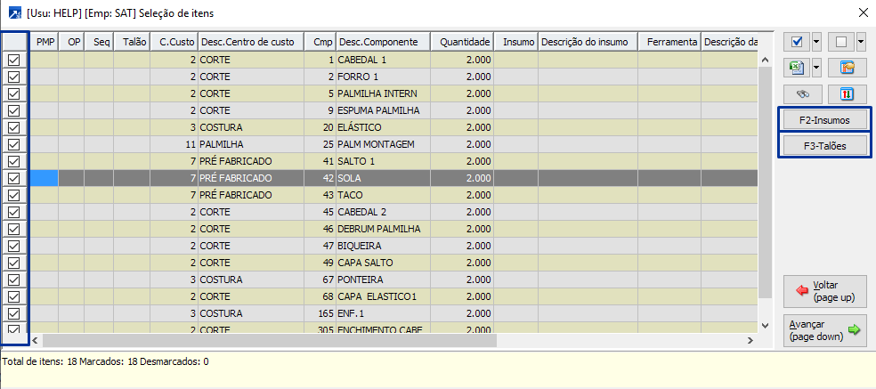 Nesta janela de seleção é possível configurar várias informações nas colunas e ainda consultar os insumos ou talões que foram acumulados no talão auxiliar por componente.