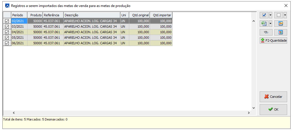 Neste momento basta selecionar quais devem ser importados (podendo ainda ajustar a quantidade através do atalho F2) e depois basta clicar em OK e confirmar para que as metas sejam importadas.
