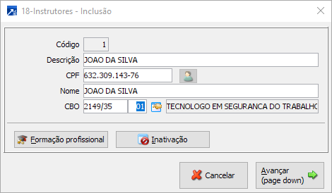 Na tela abaixo, deve ser cadastrado todos os instrutores que vão ministrar cursos aos funcionários na Empresa. Ele pode ser uma pessoa externa, do mercado ou pode ser um funcionário, parceiro, etc. Para efetuar este cadastro é necessário ter o nome, cpf, pis, número de registro da profissão legal se for o caso e na aba < formação profissional > deve ser preenchida quais formações possui. Estes instrutores serão vinculados nos registros dos cursos realizados e que serão registrados no menu 3.1-M.