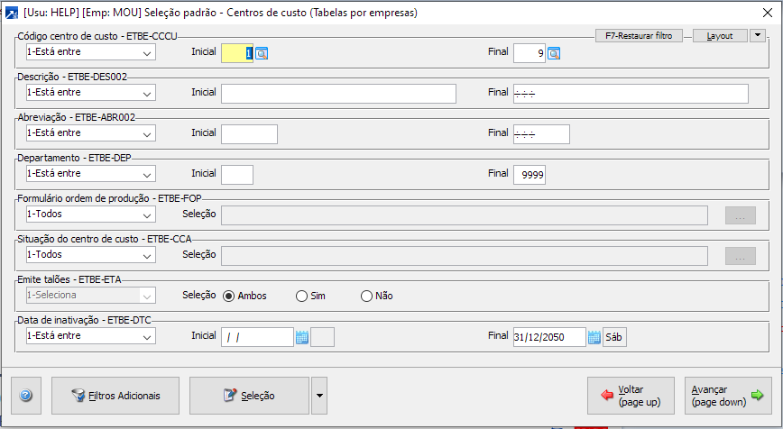 Para acessar o mesmo é necessário ir no menu GIN 2.5-M e então vai abrir a tela de seleção padrão de Centro de Custos. Nela pode ser feito filtros referente ao talão de produção que pode estar dentro do Plano Mestre de Produção.