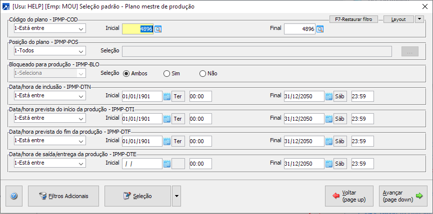 Logo após o mesmo, irá abrir um filtro de seleção padrão do Plano Mestre de Produção, onde pode ser selecionado um determinado plano ou diversos planos com alguma determinada característica.