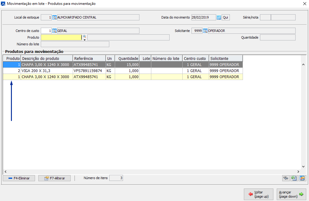 2-Código do produto aceita a inclusão de itens na tela de movimentos em lote pelo código do produto do SIGER®
