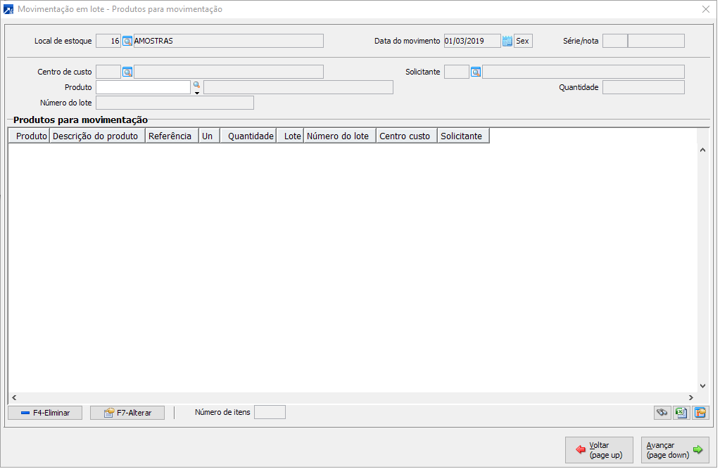 Esta rotina permite que o usuário possa fazer vários movimentos (sejam de entrada ou de saída), e é muito utilizada por empresas que necessitam fazer baixas manuais do estoque em massa de vários produtos.